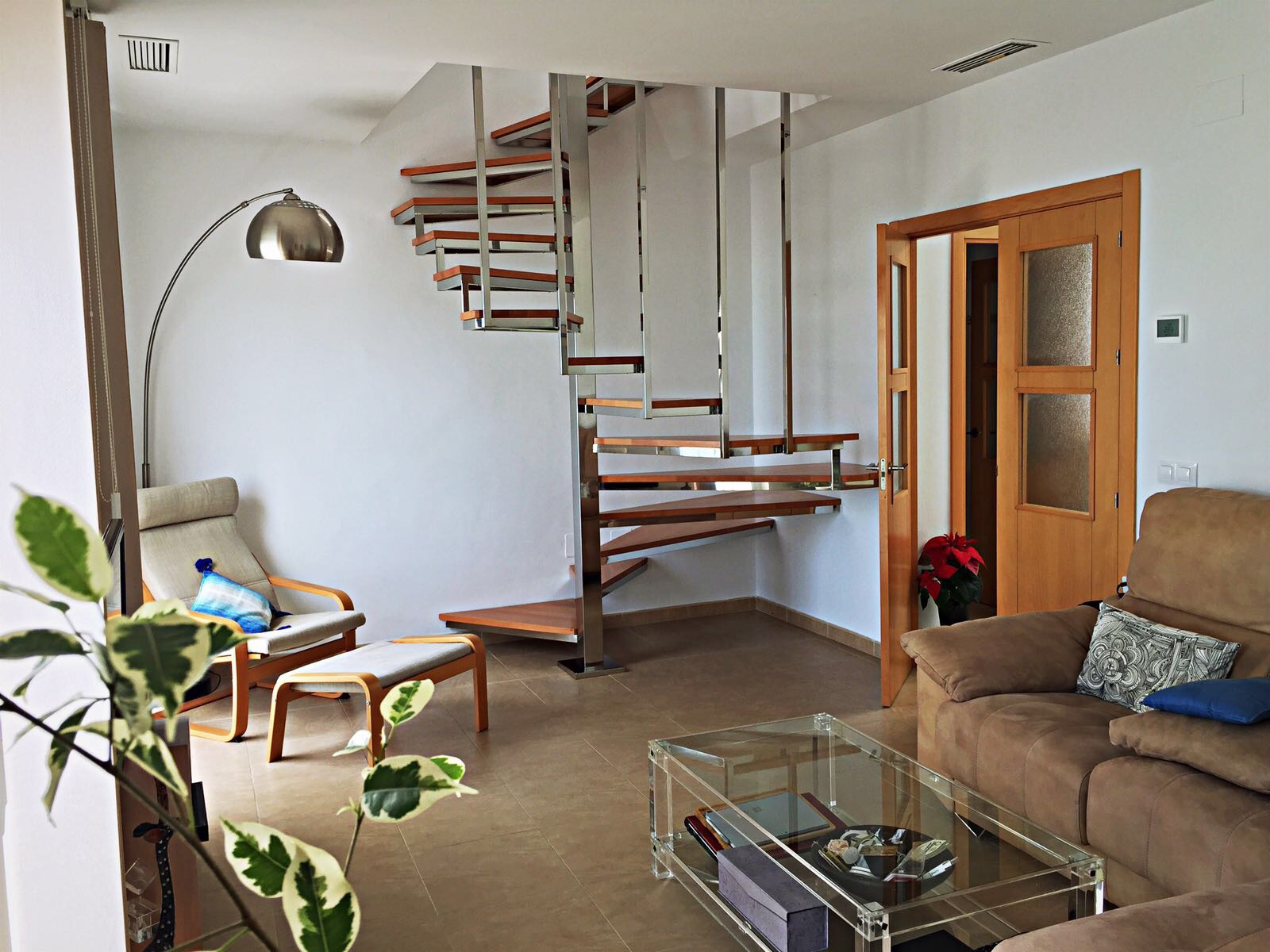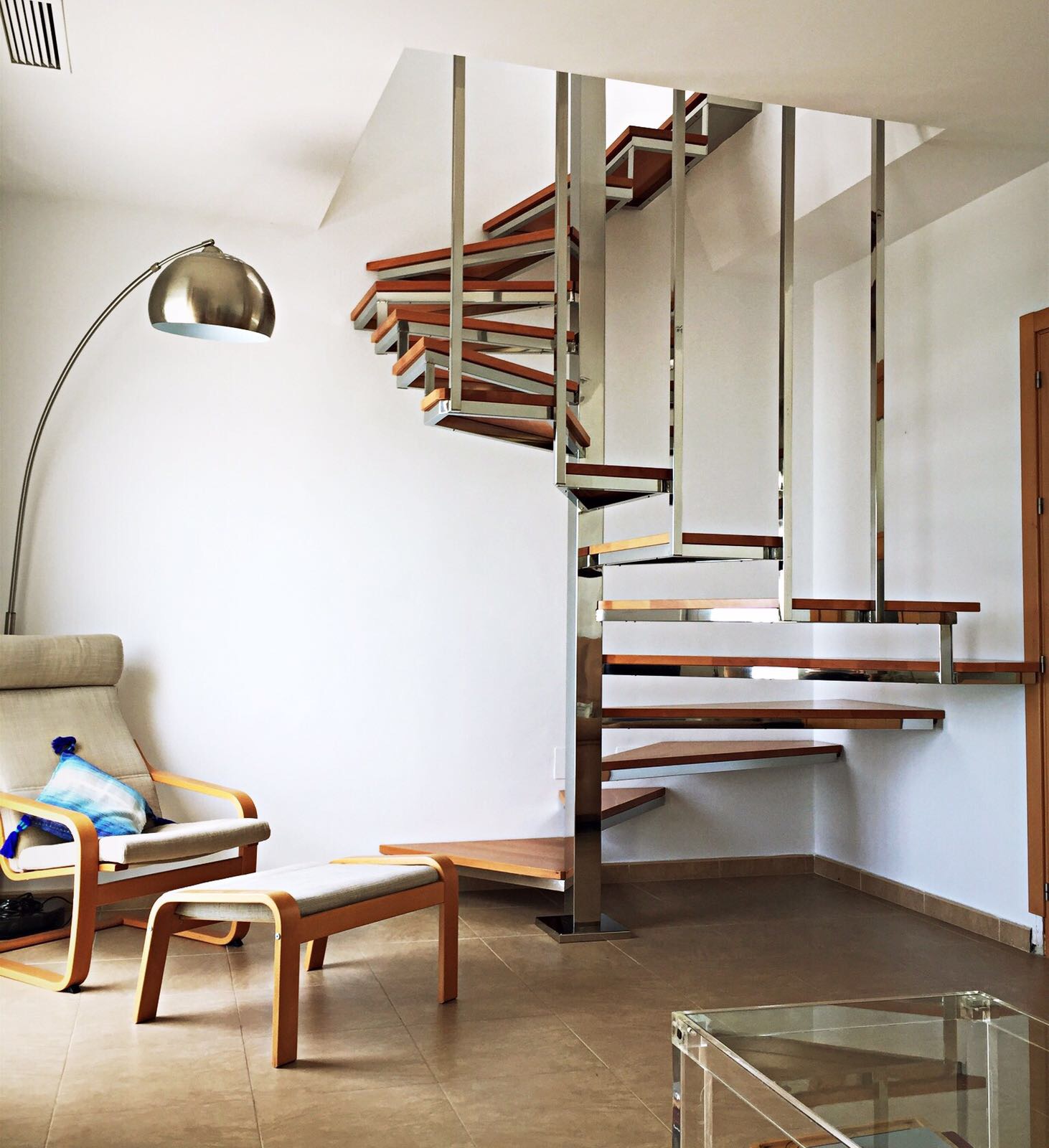 Reforma de la zona de salón-comedor y apertura de hueco en forjado para introducir un acceso directo hasta la cubierta privativa en el nivel superior mediante una escalera de acero inoxidable y peldaños de madera